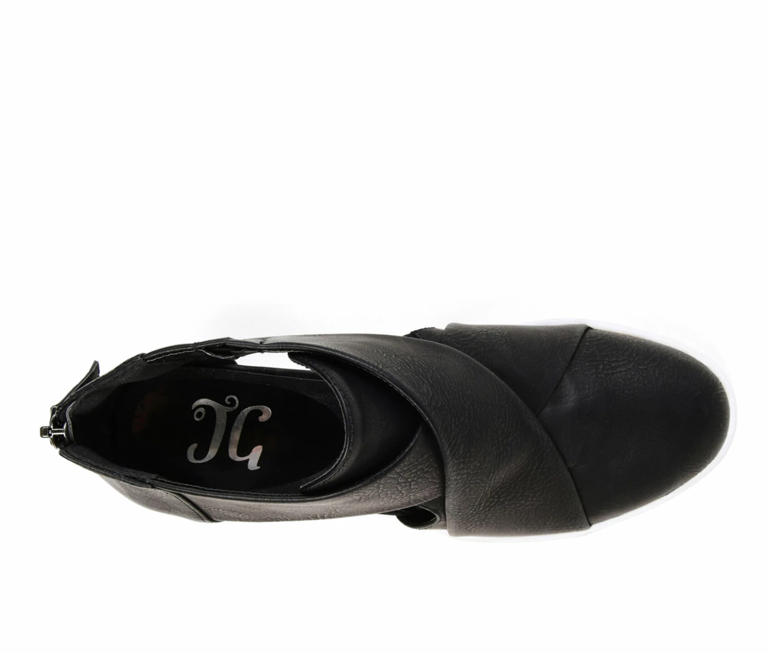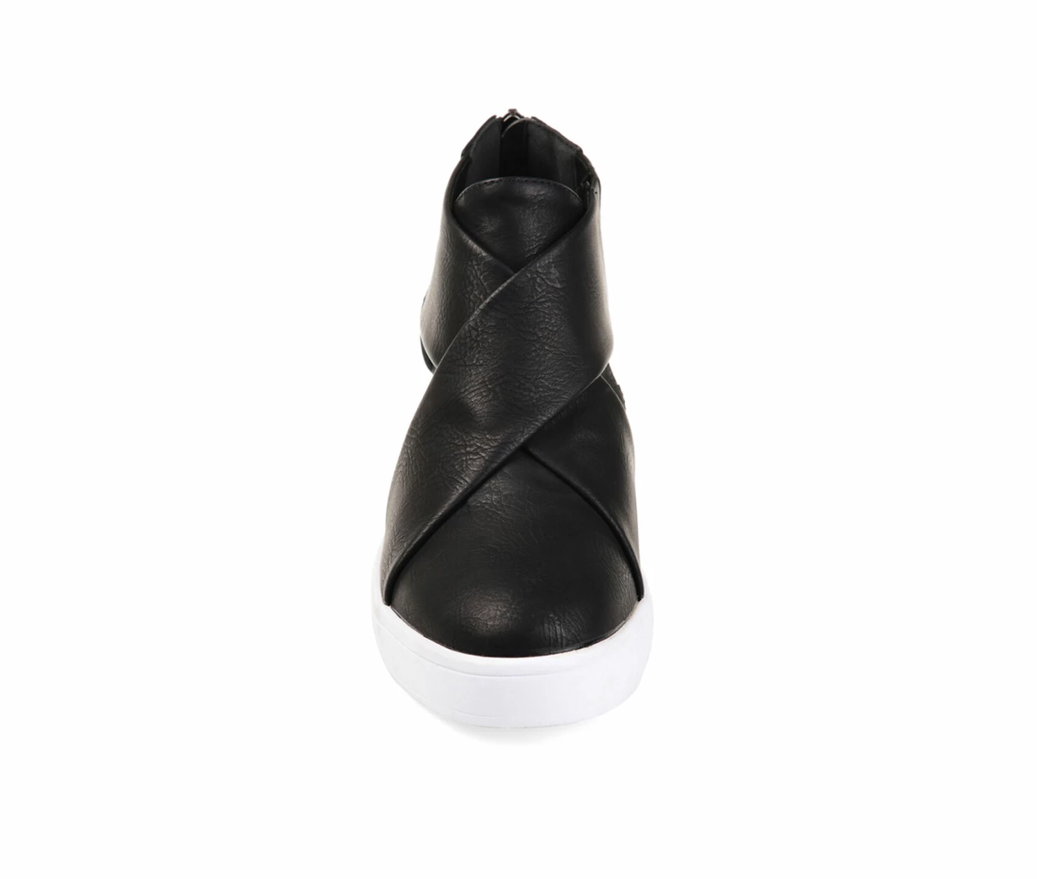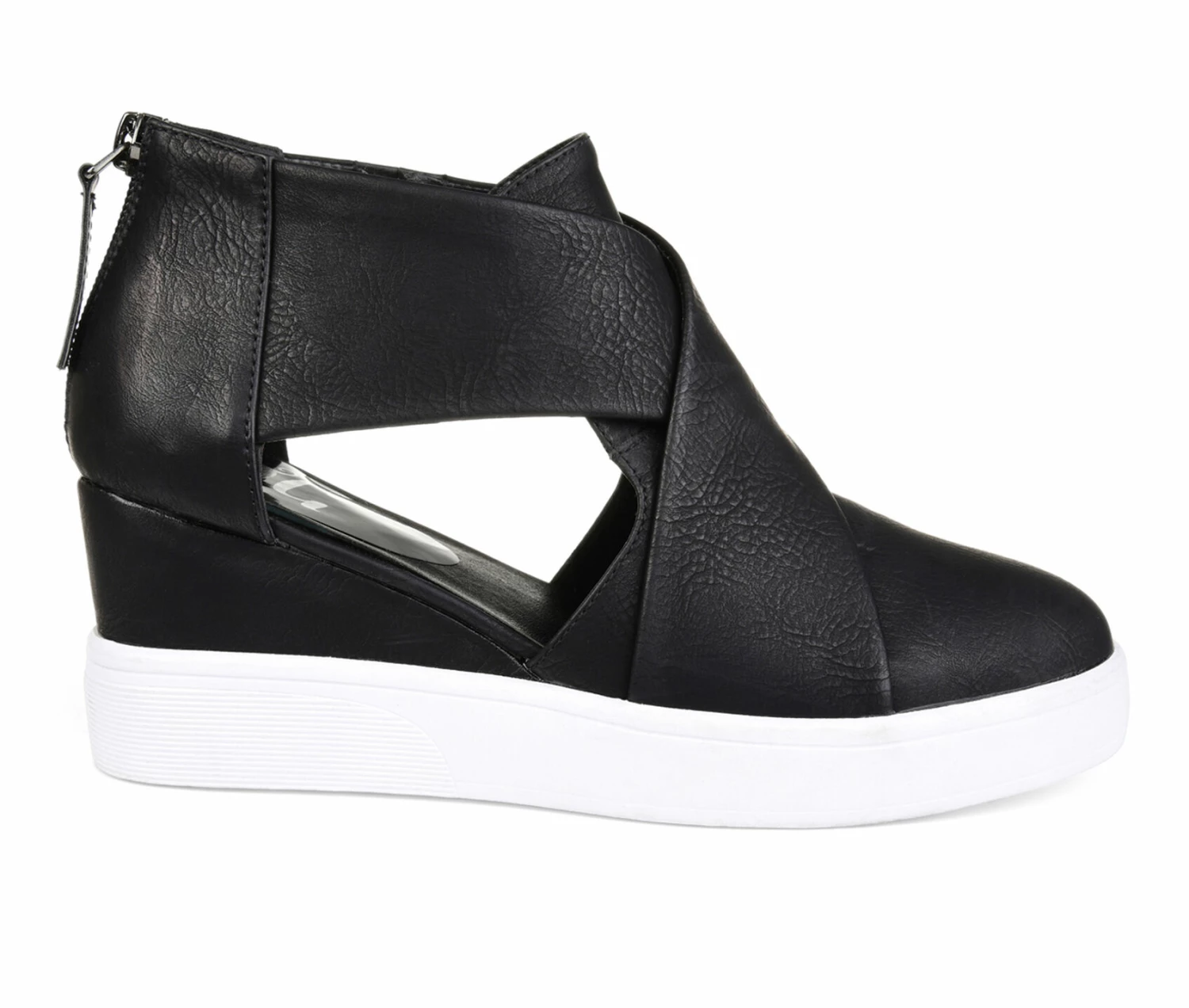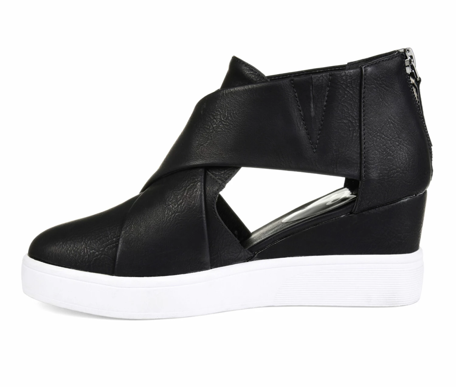 - Look effortlessly cool in fashion sneakers from Journee Collection. Soft faux leather uppers display a crisscross design on the vamps and stylish D’Orsay cut-outs at the sides. Thick outsoles and wedge heels create stylish lift to finish the look
