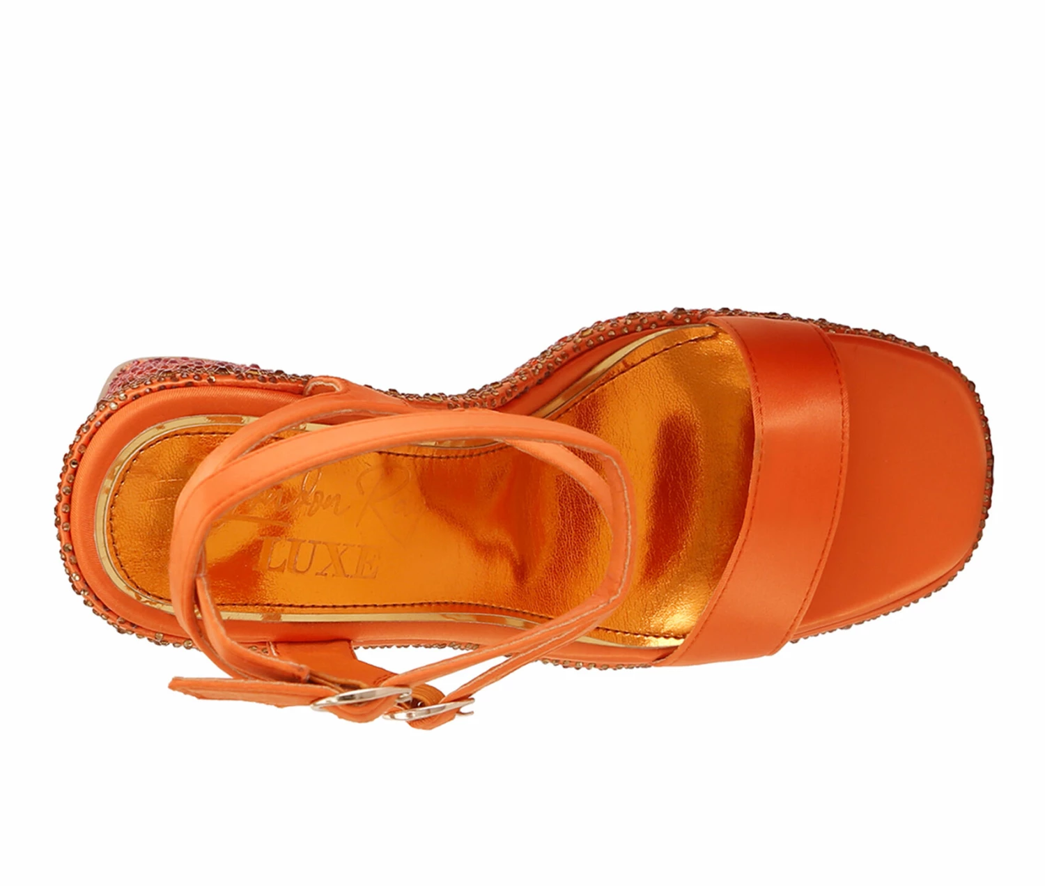 - 5″ rhinestone covered satin wrapped wedge heel / platform
